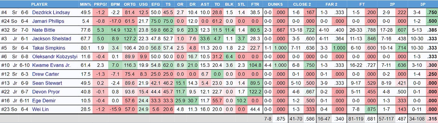 Shelstad has hit only a third of his threes through three games, which is not surprising given the shooting hand injury. The difference is small, likely only three to six points if his shooting normalizes.